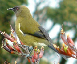 Korimako The male is olive green, with a pale underside and red eyes. Its tail and wings are a dark blue. The female is browner with a short curved bill. Bellbirds have a flue-like song and are often the song is mistaken for a tui. They are territorial during breeding season and females will attack intruders when defending their nest. grey bird with conspicuous white tipped tail. |