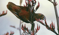 Kaka Brown with crimson underneath and under the wings. A noisy bird of the parrot family the kaka can be seen flying and circling above the bush, calling to one another over the summer months. Insects form their main diet supplemented with the nectar of the flax flowers as well as the seeds of the cones of native and non native trees. |