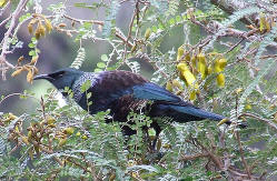 Tui Greenish blue colouring with a lacy collar of white and a prominent white tufts at the throat. The black bill is curved and the feet are grey. Known for their beautiful song the tui is one endemic bird that has thrived despite the introduction of humans to their environment. They are aggressive birds with clearly defined territories who will chase other birds away including larger birds like the kaka. |