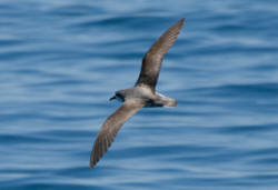 Cooks Petrel Have a white forehead, cheeks and underparts while their back is pale grey. Their bill is long and black, legs and feet blue. They breed from October through to May and then migrate to the eastern Pacific from California to Chile. |