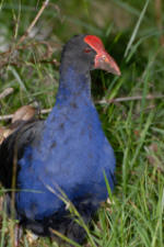 NZ Swamp Hen - Pukeko With a deep blue body with some green and black on their wings, white under their tail, a prominent blunt bright red bill and orange legs these birds are not easily missed. Mainly found around swamps and estuaries they have a diet of insects, frogs, small birds and eggs. Pukeko are a member of the rail family which includes weka. |